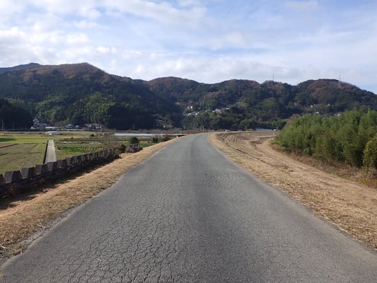 大洲市の河川沿いの見通しの良い道路で損傷部分の既存アスファルトを撤去処分して、その上でアスファルト舗装をさせていただきました。